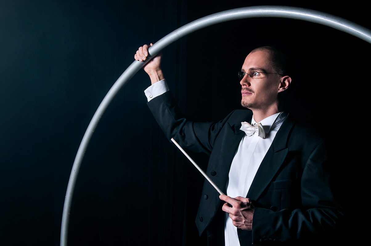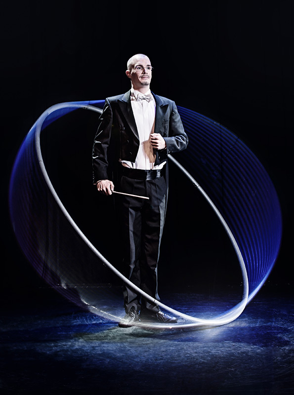 In seiner Darbietung als Dirigent holt er das auf die Bühne, was dem Zuschauer sonst vorenthalten bleibt: Das Spiel zwischen dem Dirigenten und seinem Instrument. Mit überzeugender Leichtigkeit und Ausdruckskraft, wird ein Meisterwerk aus Balance, Akrobatik und Poesie auf die Bühne gezaubert.