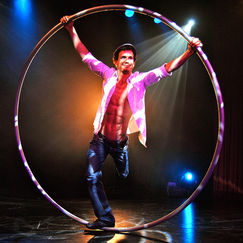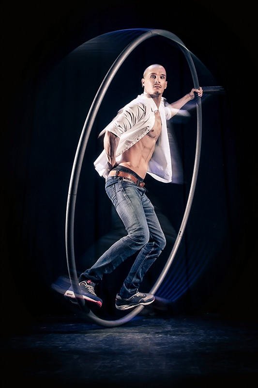 Wie von Zauberhand lässt Herr Benedict seinen Ring über die Bühne kreisen. Mit Schwung, Können und Leidenschaft manövriert er seinen Cyr Wheel durch ein Universum mit scheinbarer Schwerelosigkeit. Begleitet von elektronischen Klängen zieht Herr Benedict in seiner Darbietung Rotation dynamisch kraftvolle Kreise über die Bühnen. Der Cyr-Ring als Symbol der Einheit wird zu einer Fusion aus atemberaubender Präzision, Schnelligkeit und Schönheit.